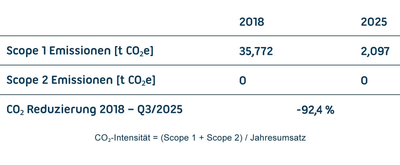 Ausgehend von 2018 bis Ende 2022 konnten wir unseren CO2 Ausstoß um 30% verringern. Unser Ziel bis 2025 ist eine Verringerung auf 50%. Dies erfolgt durch Maßnahmen wie Dienstfahrzeuge, die nach und nach auf Hybrid und Elektro umgestellt werden sowie die Installation einer PV-Anlage.